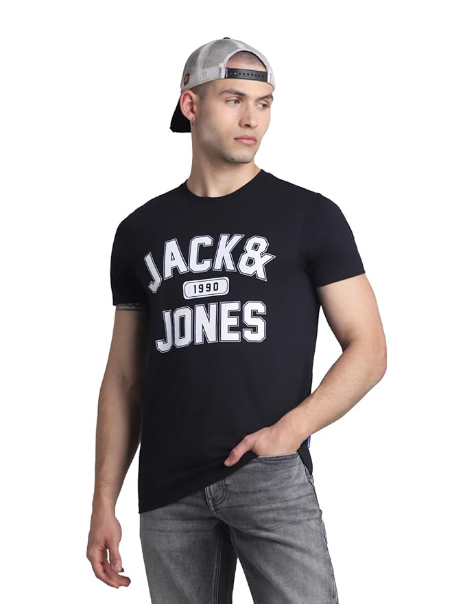 Elevate your everyday style with the JACK & JONES Men Typography Round Neck Cotton Blend Black T-Shirt till 2XL.